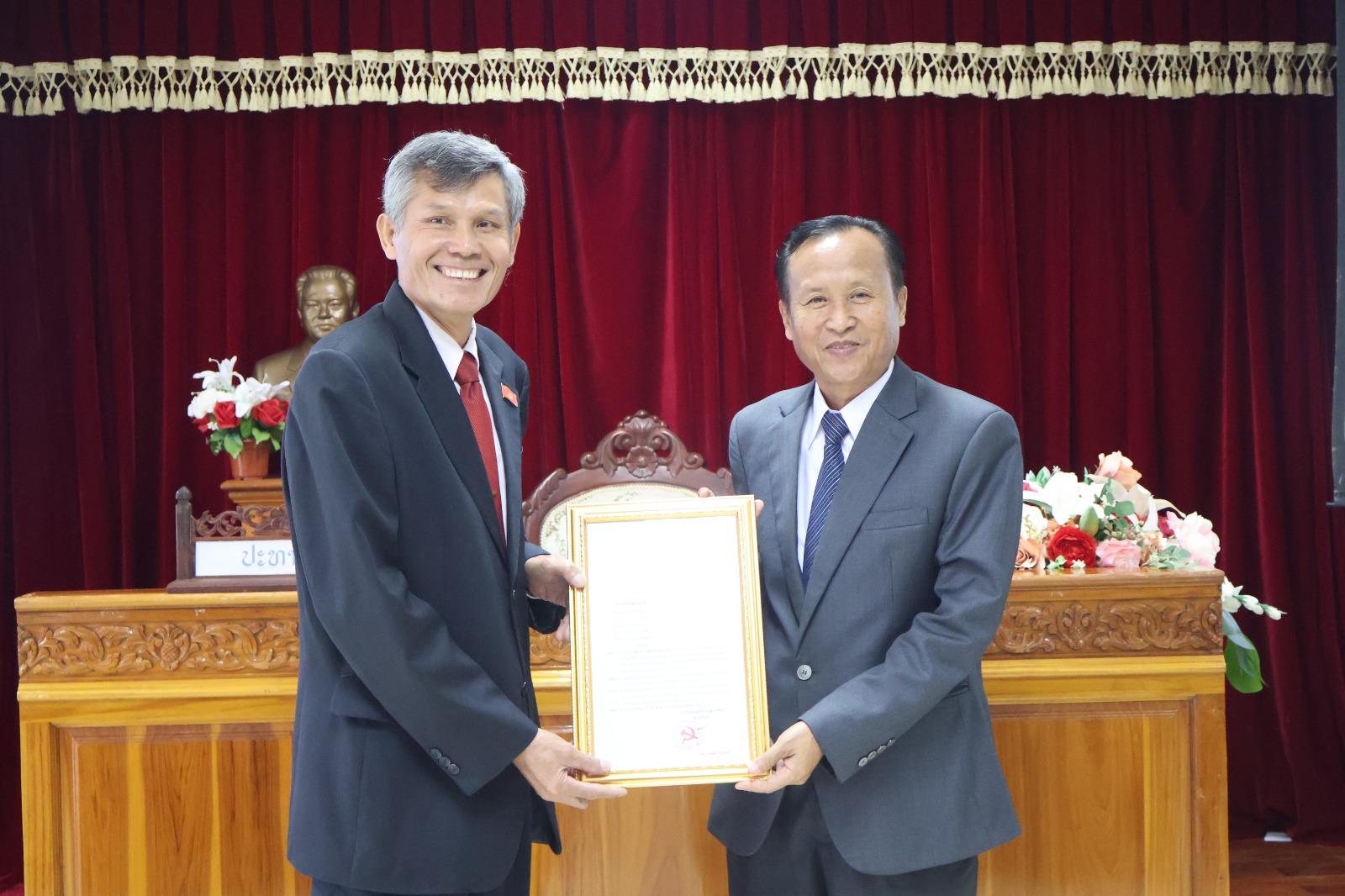 ໃນພິທີ ທ່ານ ປທ ນ. ພອນໄຊ ລາດຊະວົງ ກຳມະການຄະນະພັກ, ຫົວໜ້າກົມຈັດຕັ້ງ-ພະນັກງານ ໄດ້ຕາງໜ້າ ຜ່ານມະຕິຕົກລົງ ສະບັບເລກທີ 587/ຄລສພ ລົງວັນທີ 23 ມິຖຸນາ 2025 ວ່າດ້ວຍການອະນຸມັດໃຫ້ພະນັກງານການນຳຂັ້ນສູງອອກພັກການຮັບອຸດໜູນບຳນານ ຕົກລົງໃຫ້ ທ່ານ ປທ ແສງທອງ ພຸດທະວົງ ອອກພັກການຮັບອຸດໜູນບຳນານ ທີ່ມີອາຍຸກະສຽນ 61 ປີ, ອາຍຸການເຮັດວຽກ 37 ປີ.