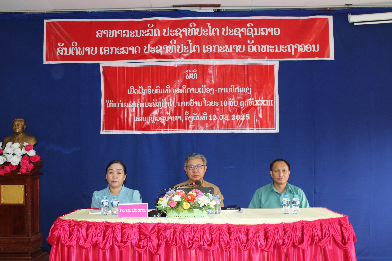 ໃນຕອນເຊົ້າ ຂອງວັນທີ 12 ສິງຫາ 2025 ທີ່ຫ້ອງປະຊຸມ ຂອງໂຮງຮຽນການເມືອງ ແລະການປົກຄອງ ແຂວງຫຼວງນໍ້າທາ ໄດ້ຈັດພິທີເປີດຝຶກອົບຮົມທິດສະດີການເມືອງ-ການປົກຄອງ ລະບົບ 10 ວັນ ຊຸດທີ XXIII ໃຫ້ເລຂາພັກບ້ານ, ອົງການປົກຄອງບ້ານ ຢູ່ເມືອງຫຼວງນ້ຳທາ ແຂວງຫຼວງນໍ້າທາ. ໂດຍເປັນປະທານ ຂອງທ່ານ ປທ ຄຳສີ ດັງສະໄຫວ ເລຂາໜ່ວຍພັກ, ຫົວໜ້າໂຮງຮຽນການເມືອງ ແລະການປົກຄອງແຂວງ. ເປັນກຽດເຂົ້າຮ່ວມ ຂອງທ່ານ ວຽງສະຫວັດ ສີພັນດອນ ກຳມະການສູນກາງພັກ, ເລຂາພັກແຂວງ, ເຈົ້າແຂວງ ແຂວງຫຼວງນໍ້າທາ; ທ່ານ ນ. ຈັນສະໄໝ ແກ້ວມະນີວົງ ຮອງເລຂາພັກເມືອງ ຜູ້ຊີ້ນຳວຽກງານແນວຄິດພັກ-ພະນັກງານ, ພ້ອມດ້ວຍບັນດາທ່ານທີ່ເປັນຄະນະຮັບຜິດຊອບການຝຶກອົບຮົມໃນຄັ້ງນີ້, ມີຕົວແທນມາຈາກຫ້ອງວ່າການແຂວງ, ໂຄສະນາອົບຮົມແຂວງ, ຄະນະຈັດຕັ້ງແຂວງ, ອົງການຈັດຕັ້ງມະຫາຊົນອ້ອມຂ້າງພາຍໃນແຂວງ, ຕະຫຼອດຮອດພະນັກງານຄູ-ອາຈານ ແລະນັກຝຶກອົບຮົມ ເຂົ້າຮ່ວມ ຈໍານວນ 30 ທ່ານ, ຍິງ 14 ທ່ານ.