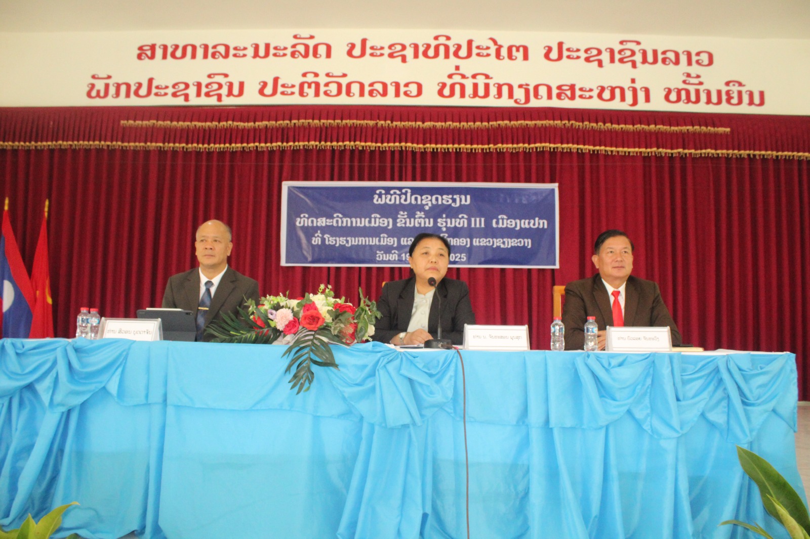 ໃນຕອນເຊົ້າວັນທີ 19 ກັນຍາ 2025 ຢູ່ທີ່ສະໂມສອນໂຮງຮຽນການເມືອງ ແລະ ການປົກຄອງ ແຂວງຊຽງຂວາງ ໄດ້ຈັດພິທີປິດຊຸດຮຽນທິດສະດີການເມືອງ ຂັ້ນຕົ້ນ ຮຸ່ນທີ III ເມືອງແປກ ໂດຍປະຕິບັດຕາມມະຕິ ຂອງຄະນະປະຈໍາພັກແຂວງຊຽງຂວາງ ວ່າດ້ວຍການອະນຸມັດປິດຊຸດຮຽນທິດສະດີການເມືອງ ຂັ້ນຕົ້ນ III ເມືອງແປກ ປະຈໍາປີ 2025, ສະບັບເລກທີ 453/ຄປພຂ, ຊຽງຂວາງ, ວັນທີ 18 ກັນຍາ 2025 ພາຍໃຕ້ການເປັນປະທານຮ່ວມ ຂອງທ່ານ ນາງ ຈັນທະສອນ ພູນສຸກ ຄະນະປະຈໍາພັກແຂວງ, ຫົວໜ້າຫ້ອງວ່າການປົກຄອງແຂວງ, ມີທ່ານ ສີວອນ ບຸດດາຈັນ ກຳມະການພັກແຂວງ, ເລຂາໜ່ວຍພັກ, ຫົວໜ້າໂຮງຮຽນການເມືອງ ແລະ ການປົກຄອງ ແຂວງຊຽງຂວາງ, ທ່ານ ບົວລອຍ ຈັນທະວົງ ຮອງເລຂາພັກເມືອງ, ປະທານຄະນະກໍາມະການປົກຄອງເມືອງແປກ, ມີບັນດາແຂກຖືກເຊີນ, ມີພະນັກງານຄູ-ອາຈານ ແລະນັກສຶກສາເຂົ້າຮ່ວມທັງໝົດ 121 ສະຫາຍ, ຍິງ 59 ສະຫາຍ.