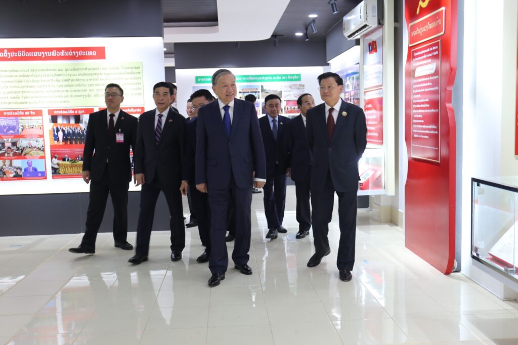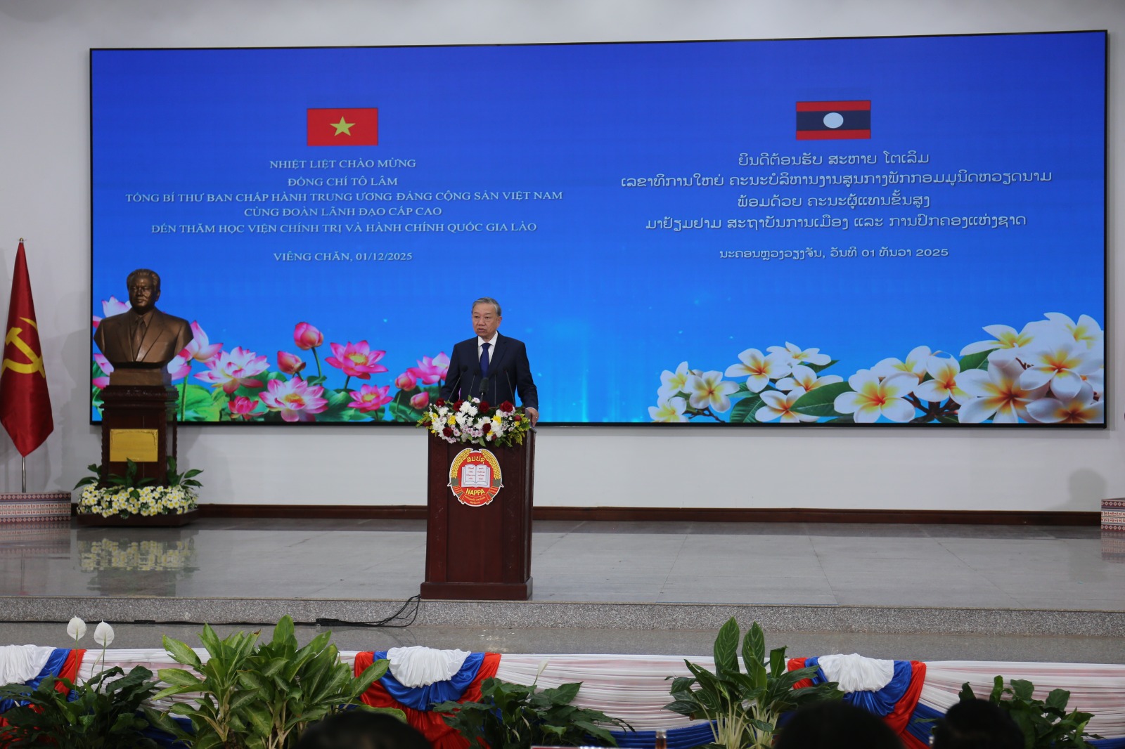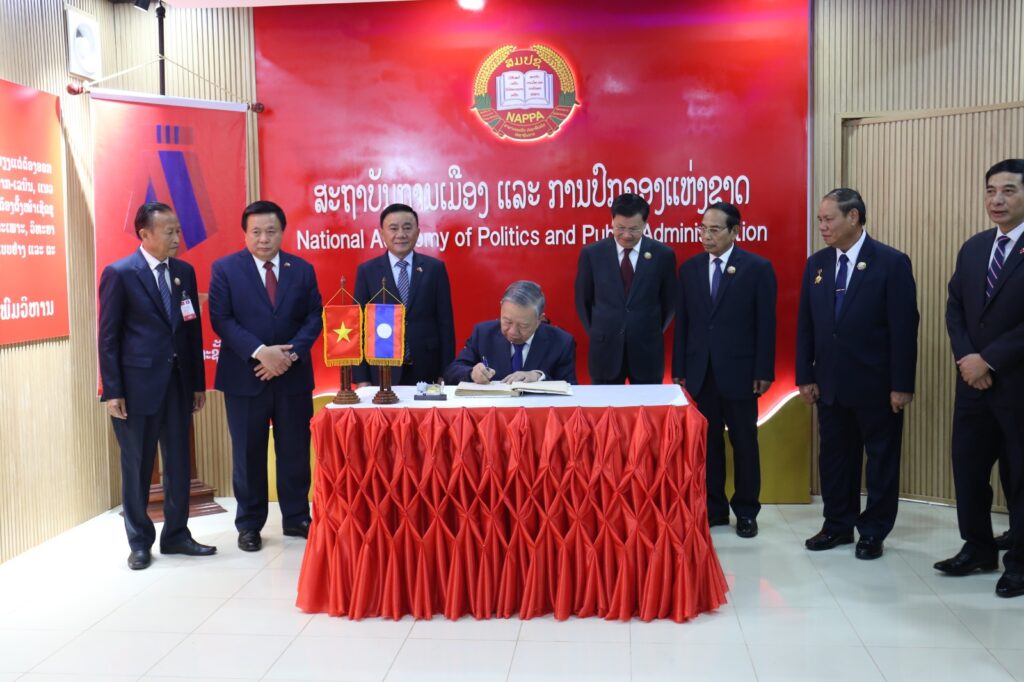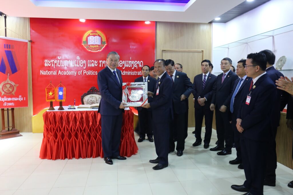 ໃນທ່າມກາງບັນຍາກາດອັນສັກສິດ ແລະ ເຕັມໄປດ້ວຍຄວາມໝາຍປະຫວັດສາດ ທີ່ທົ່ວພັກ, ທົ່ວລັດ ແລະ ປວງຊົນລາວທັງຊາດ ພວມເບີກບານມ່ວນຊື່ນສະເຫຼີມສະຫຼອງ ວັນສະຖາປະນາ ສປປ ລາວ ຄົບຮອບ 50 ປີ ແລະ ກະກຽມໃຫ້ແກ່ກອງປະຊຸມໃຫຍ່ ຄັ້ງທີ XII ຂອງພັກ, ໃນຕອນບ່າຍຂອງວັນທີ 1 ທັນວາ 2025, ເວລາ 14:30 ໂມງ, ສະຫາຍ ໂຕເລິມ ເລຂາທິການໃຫຍ່ ຄະນະບໍລິຫານງານສູນກາງພັກກອມມູນິດຫວຽດນາມ ພ້ອມດ້ວຍຄະນະຜູ້ແທນຂັ້ນສູງ ໄດ້ເດີນທາງພົບປະໂອ້ລົມ ຢູ່ ສະຖາບັນການເມືອງ ແລະ ການປົກຄອງແຫ່ງຊາດ (ສມປຊ).