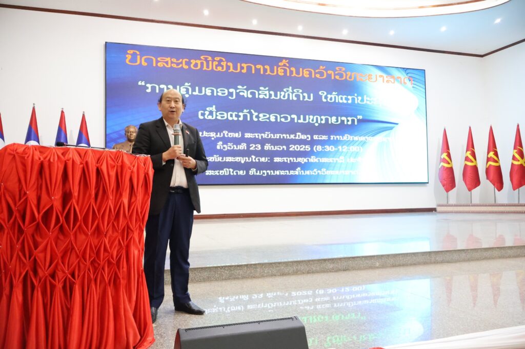 ໃນບົດລາຍງານຜົນການຄົ້ນຄວ້າ ຫົວຂໍ້ທີ 1: “ການຄຸ້ມຄອງການຈັດສັນທີ່ດິນ ເພື່ອແກ້ໄຂຄວາມທຸກຍາກ” ນຳສະເໜີໂດຍ ທ່ານ ປອ ລີວາເມັງ ລີບົວປາວ ແລະ ທ່ານ ປທ ນາງ ບຸນມີ ຈຸນລະຈັກ ຮອງຫົວໜ້າ ສມປຊ ໄດ້ຊີ້ໃຫ້ເຫັນວ່າ: ຕະຫຼອດໄລຍະ 30 ປີຜ່ານມາ, ພັກ-ລັດ ໄດ້ມີຄວາມພະຍາຍາມໃນການມອບດິນ-ມອບປ່າ ແລະ ອອກໃບຕາດິນໃຫ້ປະຊາຊົນ ເພື່ອເປັນພາຫະນະການຜະລິດທີ່ໝັ້ນຄົງ. ເຖິງຢ່າງໃດກໍຕາມ, ຜົນການສຶກສາພົບວ່າ ຍັງມີສິ່ງທ້າທາຍຫຼາຍດ້ານ ເຊັ່ນ: ການຈັດສັນທີ່ດິນຂັ້ນເມືອງ ແລະ ຂັ້ນບ້ານ ຍັງບໍ່ທັນສຳເລັດທົ່ວປະເທດ (ຍັງຄ້າງ 98 ເມືອງ ແລະ ກວ່າ 5,000 ບ້ານ), ລະບົບຖານຂໍ້ມູນທີ່ດິນຍັງບໍ່ທັນທັນສະໄໝ ແລະ ເຊື່ອມໂຍງກັນ, ລວມໄປເຖິງປະກົດການຫຍໍ້ທໍ້ໃນການບຸກລຸກຈັບຈອງທີ່ດິນລັດ ແລະ ເຂດຫວງຫ້າມ.