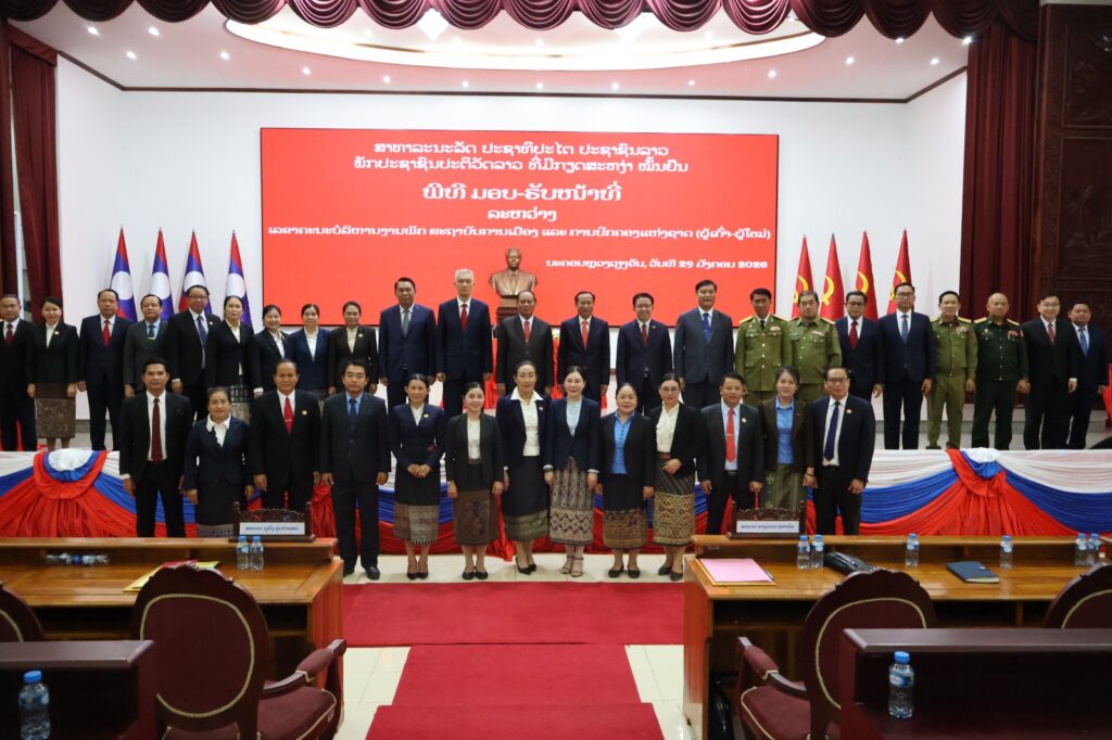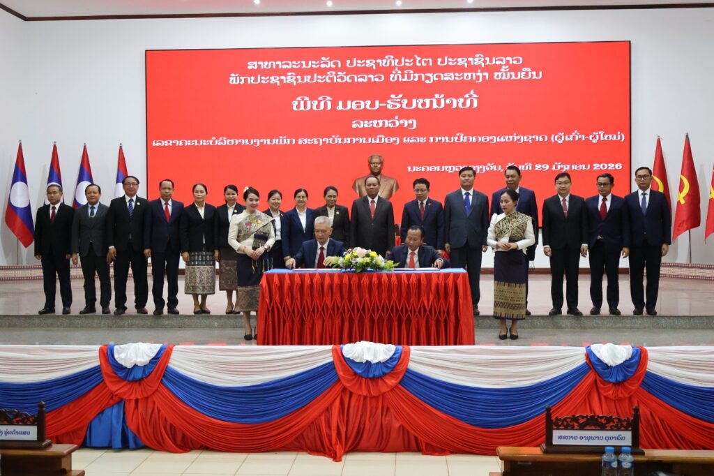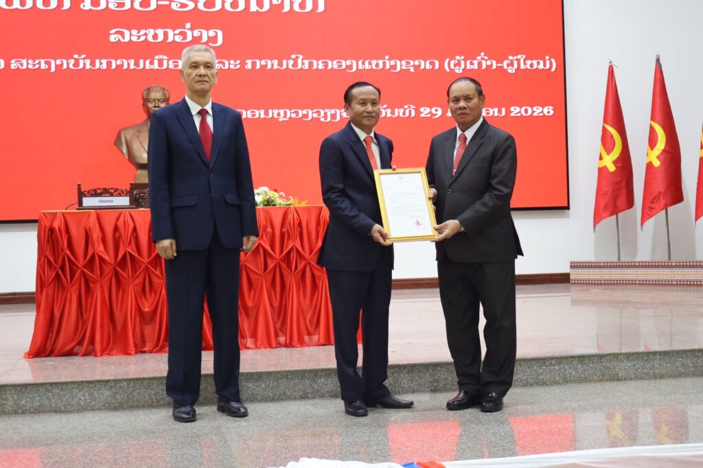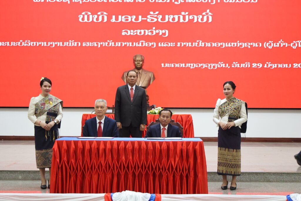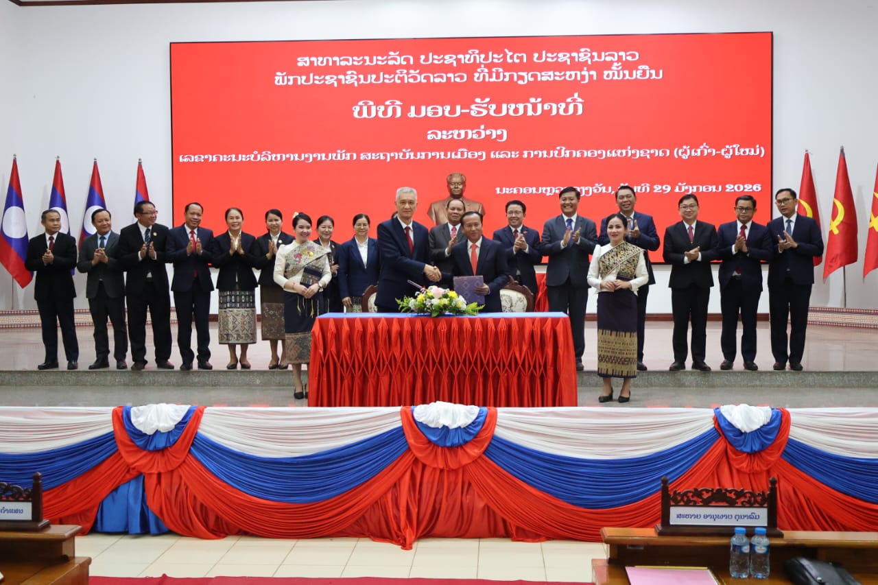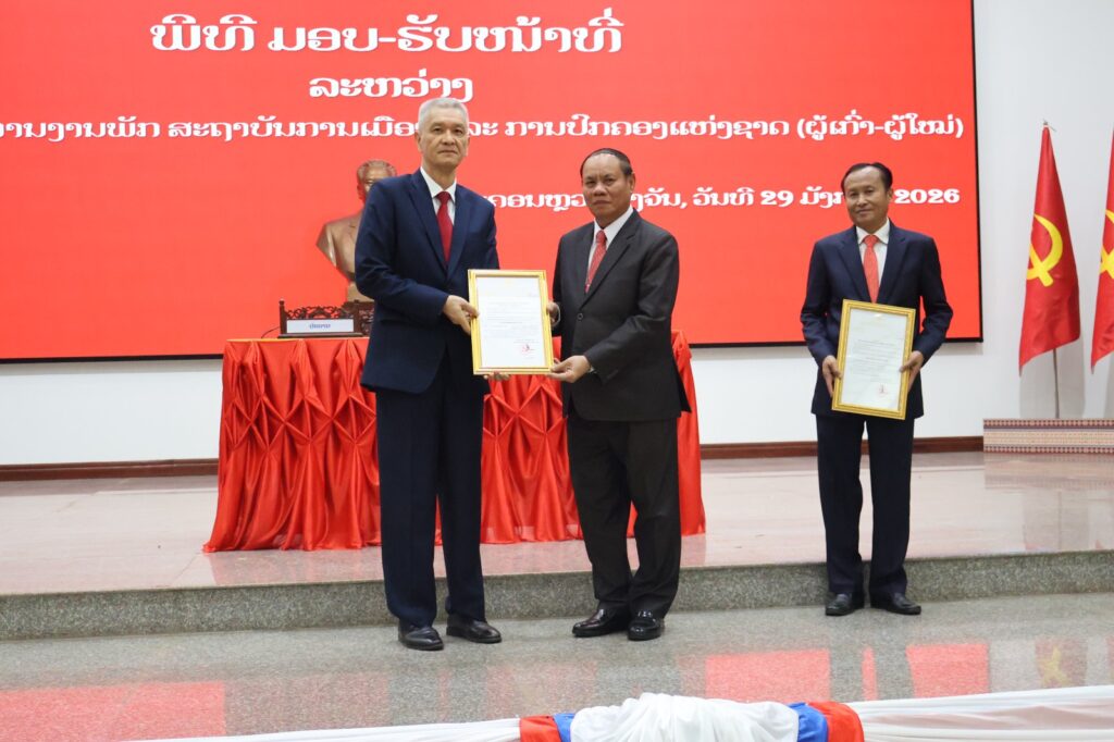 ໃນຕອນບ່າຍຂອງ ວັນພະຫັດ, ວັນທີ 29 ມັງກອນ 2026, ທີ່ ສະຖາບັນການເມືອງ ແລະ ການປົກຄອງແຫ່ງຊາດ (ສມປຊ) ໄດ້ມີພິທີມອບ-ຮັບໜ້າທີ່ ລະຫວ່າງ ສະຫາຍ ຮສ ພູວົງ ອຸ່ນຄຳແສນ ເລຂາຄະນະບໍລິຫານງານພັກ, ຫົວໜ້າສະຖາບັນການເມືອງ ແລະ ການປົກຄອງແຫ່ງຊາດ (ຜູ້ເກົ່າ) ແລະ ສະຫາຍ ປອ ອານຸພາບ ຕຸນາລົມ ເລຂາທິການສູນກາງພັກ, ເລຂາຄະນະບໍລິຫານງານພັກ, ຫົວໜ້າສະຖາບັນການເມືອງ ແລະ ການປົກຄອງແຫ່ງຊາດ (ຜູ້ໃໝ່).