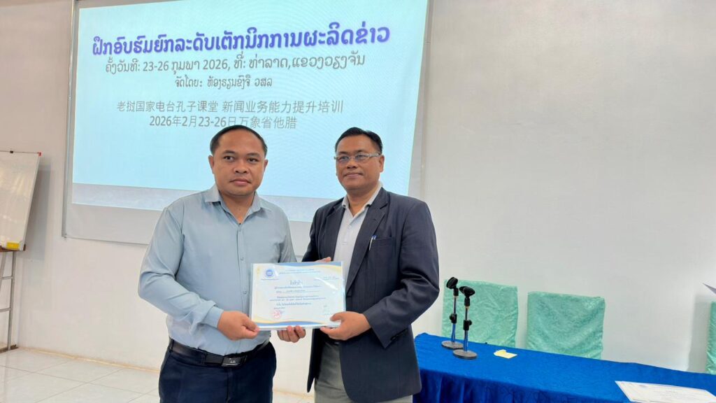 ຫຼ້າສຸດ, ໃນລະຫວ່າງວັນທີ 24-26 ກຸມພາ 2026 ທີ່ຜ່ານມາ, ທີ່ເມືອງແກ້ວອຸດົມ ແຂວງວຽງຈັນ, ຫ້ອງຮຽນຂົງຈື້ ຂອງວິທະຍຸກະຈາຍສຽງແຫ່ງຊາດລາວ (ວສລ) ໄດ້ເປັນເຈົ້າພາບຈັດຊຸດຝຶກອົບຮົມຍົກລະດັບເຕັກນິກການຜະລິດຂ່າວຢ່າງເປັນທາງການ. ພິທີດັ່ງກ່າວໄດ້ຮັບກຽດເຂົ້າຮ່ວມຊີ້ນຳໂດຍ ທ່ານ ນາງ ສິມມະນີ ແກ້ວແກ່ນ ຜູ້ອໍານວຍການໃຫຍ່ ວສລ, ທ່ານ ວຽງວັດທະນາ ຊະນະພານ ຮອງຜູ້ອໍານວຍການໃຫຍ່ ວສລ, ພ້ອມດ້ວຍຫົວໜ້າຫ້ອງຮຽນຂົງຈື້ ວສລ, ບັນດາວິທະຍາກອນ ແລະ ທີ່ສຳຄັນແມ່ນມີສໍາມະນາກອນຈາກຫ້ອງຮຽນຂົງຈື້ 5 ແຫ່ງ ເຊິ່ງໃນນັ້ນ ສະຖາບັນການເມືອງ ແລະ ການປົກຄອງແຫ່ງຊາດ ໄດ້ນຳສົ່ງ ທ່ານ ປທ ຕາອັອດ ແສນທະວີສຸກ ເຂົ້າຮ່ວມການຝຶກອົບຮົມ.