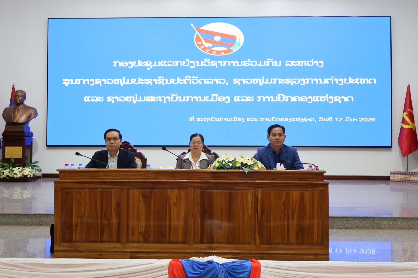 ໃນຕອນບ່າຍຂອງວັນທີ 12 ມີນາ 2026, ທີ່ສະຖາບັນການເມືອງ ແລະ ການປົກຄອງແຫ່ງຊາດ (ສມປຊ) ໄດ້ມີການຈັດກອງປະຊຸມພົບປະແລກປ່ຽນວຽກງານຊາວໜຸ່ມ ແລະ ວຽກງານການຄົ້ນຄວ້າວິທະຍາສາດ ຂຶ້ນຢ່າງຄຶກຄື້ນ ແລະ ມີຄວາມໝາຍສຳຄັນທາງດ້ານການເມືອງຢ່າງເລິກເຊິ່ງ ຊຶ່ງຈັດຂຶ້ນທີ່ສະໂມສອນໃຫຍ່ ສມປຊ. ກອງປະຊຸມດັ່ງກ່າວ ແມ່ນການຮ່ວມມືປະຫວັດສາດ ລະຫວ່າງ 3 ອົງການສຳຄັນ ຄື: ສູນກາງຊາວໜຸ່ມປະຊາຊົນປະຕິວັດລາວ, ກະຊວງການຕ່າງປະເທດ ແລະ ສະຖາບັນການເມືອງ-ການປົກຄອງແຫ່ງຊາດ.