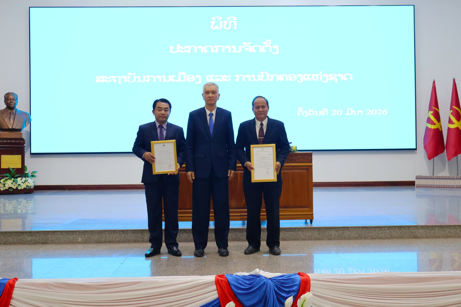ໃນຕອນເຊົ້າວັນທີ 20 ມີນາ 2026, ຢູ່ທີ່ສະຖາບັນການເມືອງ ແລະ ການປົກຄອງແຫ່ງຊາດ (ສມປຊ) ໄດ້ຈັດພິທີປະກາດການຈັດຕັ້ງພະນັກງານນຳພາ-ຄຸ້ມຄອງຂຶ້ນຢ່າງເປັນທາງການ. ພິທີດັ່ງກ່າວໃຫ້ກຽດເຂົ້າຮ່ວມເປັນປະທານ ໂດຍ: ທ່ານ ປອ ອານຸພາບ ຕຸນາລົມ, ເລຂາທິການສູນກາງພັກ, ເລຂາຄະນະບໍລິຫານງານພັກ, ຫົວໜ້າ ສມປຊ. ພ້ອມນີ້, ຍັງມີຄະນະພັກ, ຄະນະນຳ, ພະນັກງານ, ຄູ-ອາຈານ ແລະພາກສ່ວນທີ່ກ່ຽວຂ້ອງເຂົ້າຮ່ວມຢ່າງພ້ອມພຽງ.