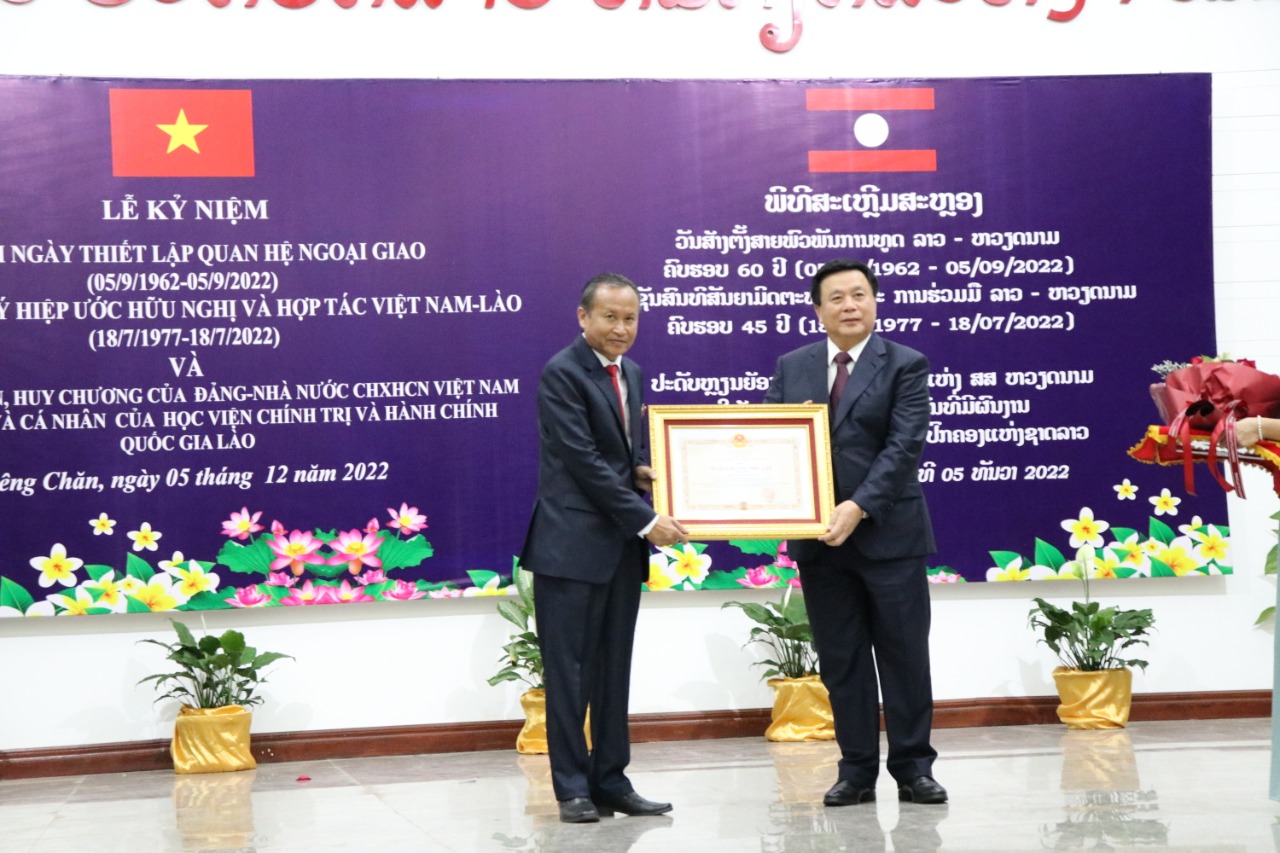 ເນື່ອງໃນໂອກາດທີ່ມີຄວາມໝາຍສໍາຄັນນີ້, ຂ້າພະເຈົ້າ ຂໍຕາງໜ້າໃຫ້ຄະນະພັກ, ຄະນະອໍານວຍການສະຖາບັນ ຂໍສະແດງຄວາມຮູ້ບຸນຄຸນຢ່າງເລິກເຊິ່ງຕໍ່ກັບສະຫາຍການນໍາພັກ-ລັດ ສສ ຫວຽດນາມ ທີ່ໄດ້ຕົກລົງປະດັບບັນດາຫຼຽນໄຊ, ຫຼຽນກາ ຂອງພັກ-ລັດຖະບານ ສສ ຫວຽດນາມ ໃຫ້ບັນດາກົມກອງ ແລະ ບຸກຄົນ ຂອງສະຖາບັນການເມືອງ ແລະ ການປົກຄອງແຫ່ງຊາດ. ນີ້ຖືວ່າເປັນຂອງຂວັນອັນລໍ້າຄ່າ ທີ່ພັກ-ລັດ ແລະ ປະຊາຊົນຫວຽດນາມ ມອບໃຫ້ແກ່ພວກຂ້າພະເຈົ້າ ແລະ ກໍ່ຊີ້ໃຫ້ເຫັນເຖິງຄວາມຮັບຜິດຊອບອັນໜັກໜ່ວງ ແຕ່ມີກຽດສະຫງ່າ ໃນການປົກປັກຮັກສາ ແລະ ເພີ່ມພູນຄູນສ້າງສາຍພົວພັນມິດຕະພາບອັນຍິ່ງໃຫຍ່, ຄວາມສາມັກຄີພິເສດ ແລະ ການຮ່ວມມືຮອບດ້ານ ລະຫວ່າງສອງພັກ-ສອງລັດ ແລະ ປະຊາຊົນສອງຊາດ ລາວ-ຫວຽດນາມ, ຫວຽດນາມ-ລາວ.